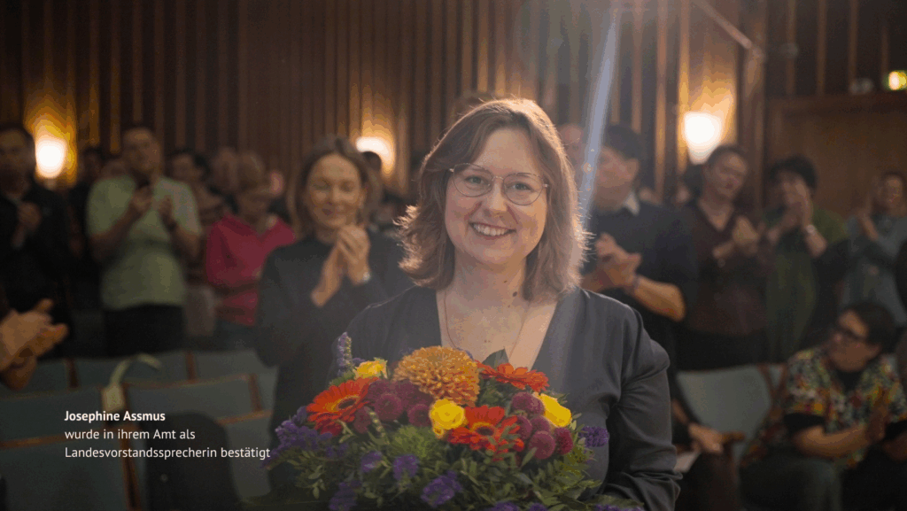 Josephine Assmus betonte in ihrer Bewerbungsrede, dass Mut, Klarheit und Zusammenhalt die Grundlage für einen echten politischen Aufbruch bilden: „Die vergangenen Jahre waren geprägt von Gegenwind auf allen Ebenen. In dieser Zeit der multiplen und drängenden Krisen ist die Klimakrise nicht mehr im Zentrum der Aufmerksamkeit. Wir sehen einen Backlash gegen Frauen- und Queere-Rechte und unsägliche Stadtbild Debatten, die unsere Diskurse bestimmen“, so Assmus. Es sei okay in Krisenzeiten auch mal zu zweifeln. Immerhin sei Zweifel ein wichtiges Korrektiv gegen Überheblichkeit, sagt Assmus in ihrer Rede. Wichtig sei es aber sich dann wieder zusammenzureißen, den Rücken gradezumachen und weiter voranzugehen.